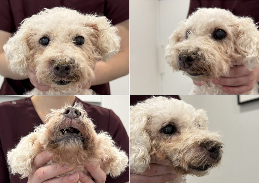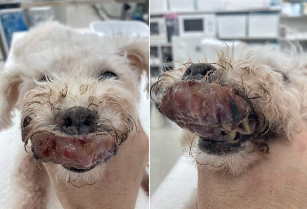 高齢のため、持病のため、費用のため、そして可愛い顔を変えたくないため、顎骨切除が選択できないことも多いのが現状です。今回は上顎の先端にメラノーマ(無色素性)が発生したKちゃんのケースを紹介します。