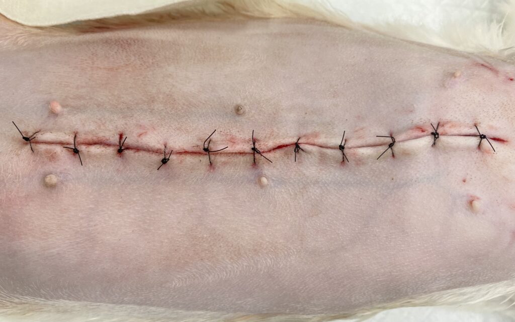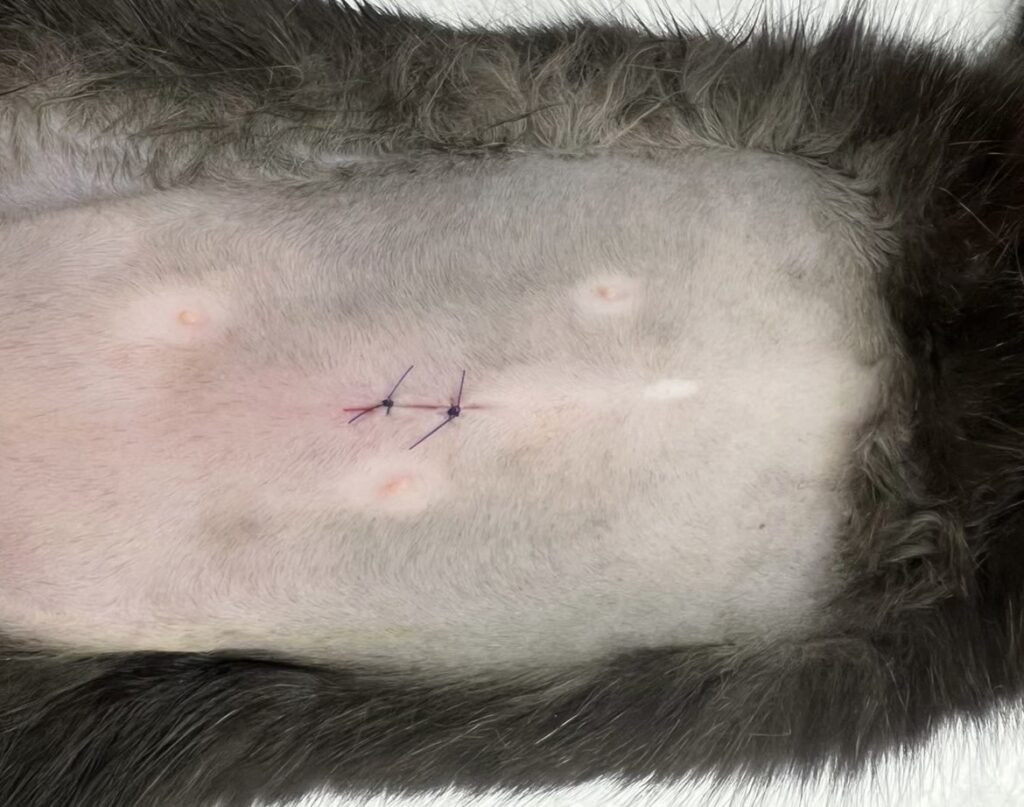 滅菌を保つため、毛刈りと消毒を実施します。腹腔鏡手術であるためリスクは低いですが、徹底した感染防止対策を講じています。