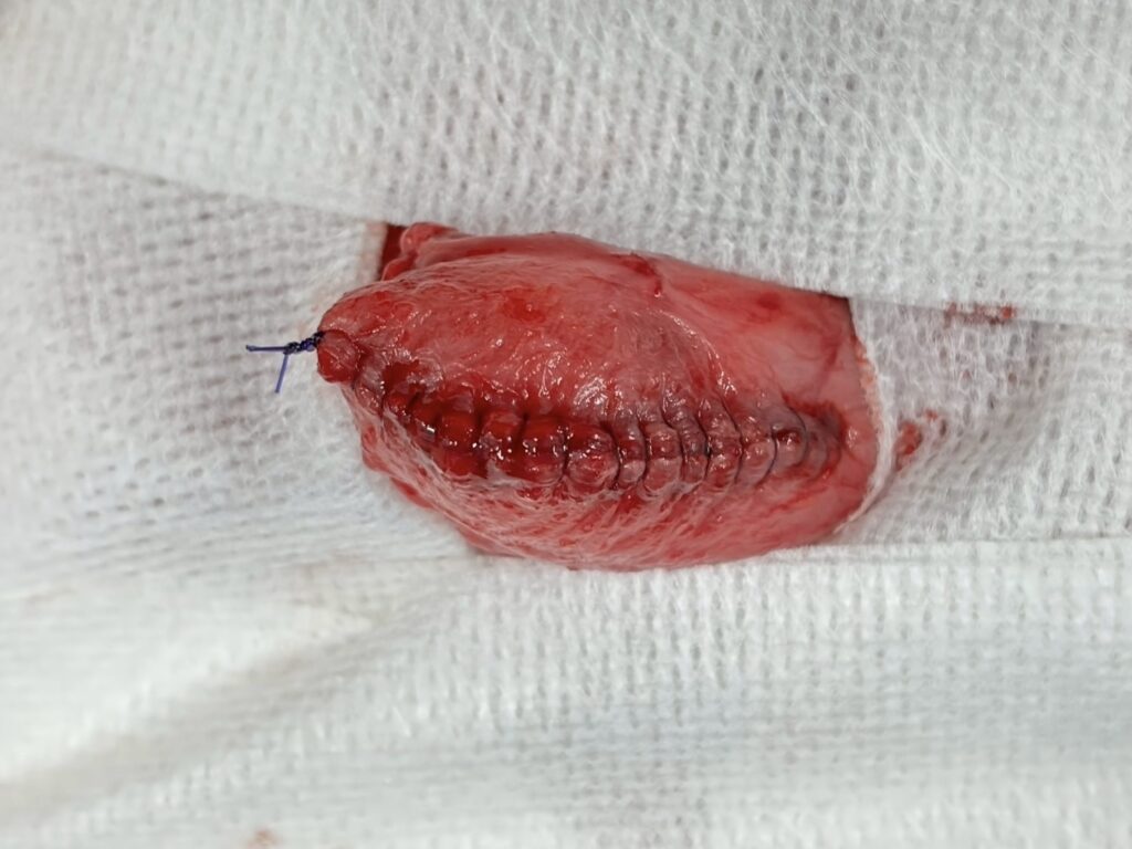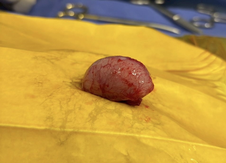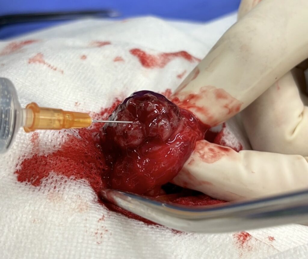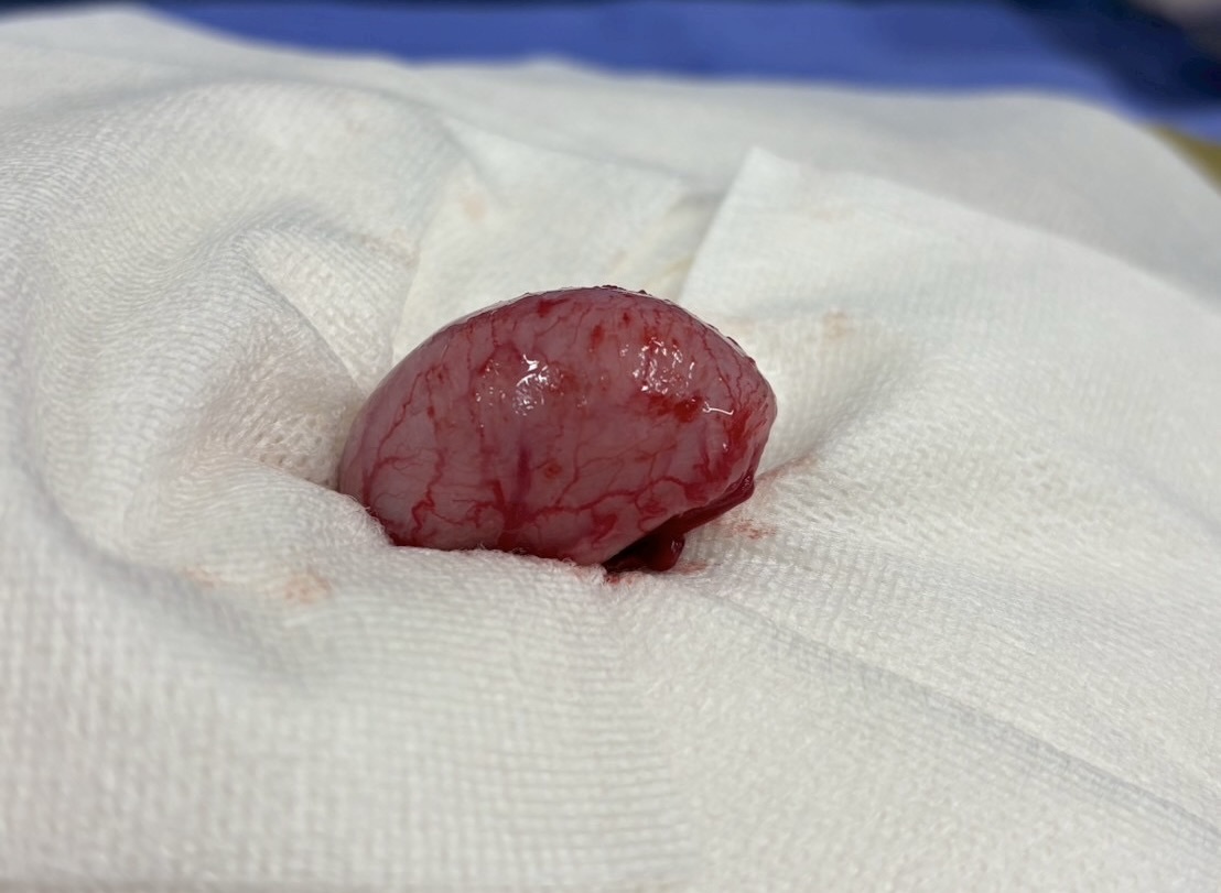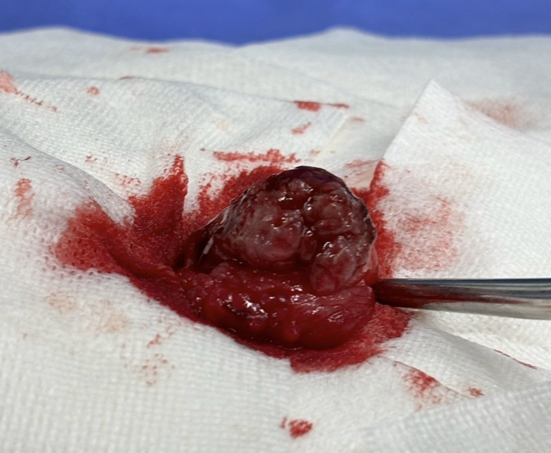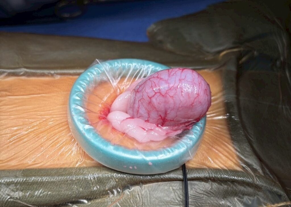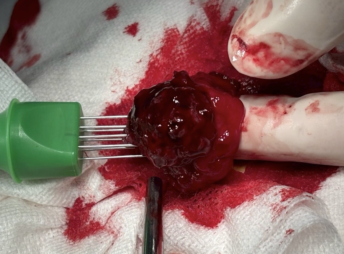 膀胱を切開し、反転させます。画像では反転した膀胱内部から癌(赤黒い部分)がせり出しています。