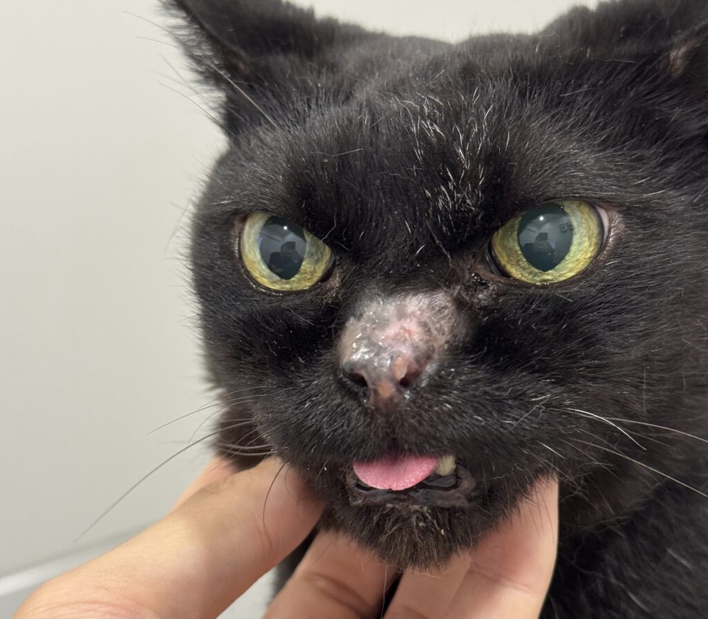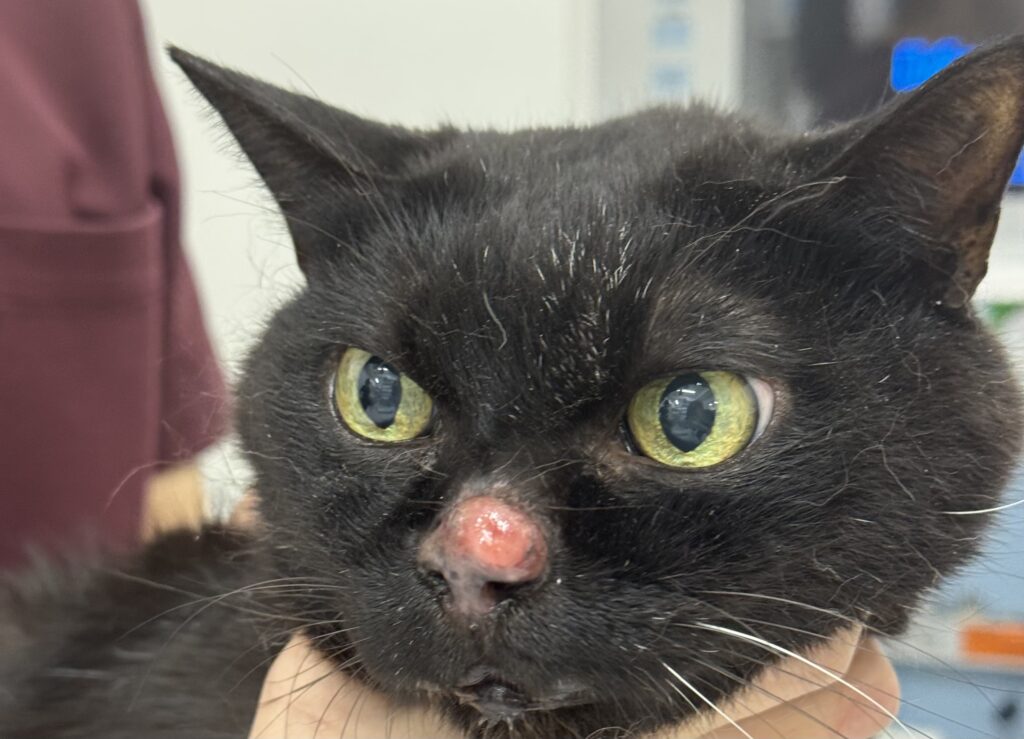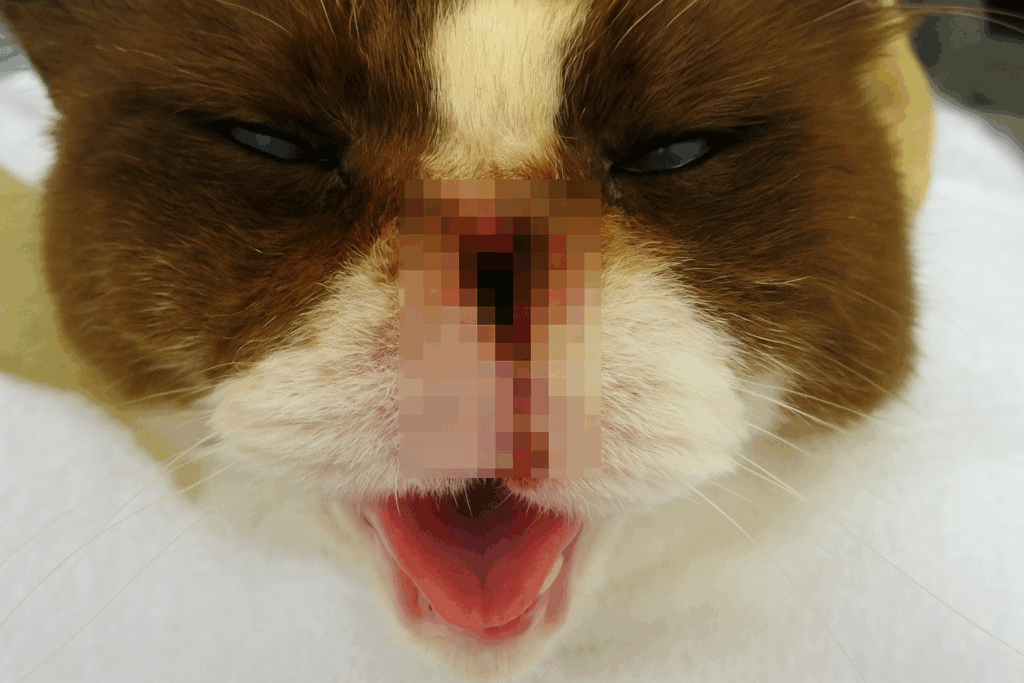 顔面に発生する悪性腫瘍。切除することで根治が十分に狙えますが、可愛いお顔を切り取る必要があり、切除が受け入れられない場合も多いです。特に高齢の場合、残りの余生を考えると、がんの根治ではなく『がんとの共存』を選んでも良いと思います。電気化学療法ではメスを入れることなく、癌の消失(寛解)を目指す事ができ日帰りで実施可能です。