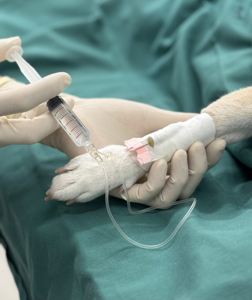 針を腫瘍に差し込むため、消毒をし実施します。不動化のために軽麻酔をかけていきます。