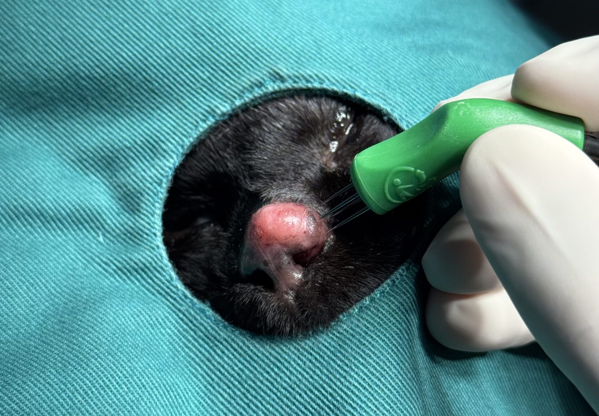 術後1ヶ月程度で腫瘍は退縮。可愛いお鼻は温存できました。毛が生えてくるのを待ちます。今後何回でも実施が可能です。