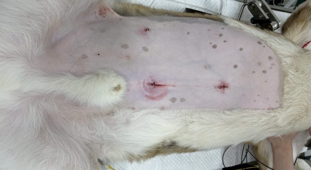 滅菌を保つため、毛刈りと消毒を実施します。腹腔鏡手術であるためリスクは低いですが、徹底した感染防止対策を講じています。