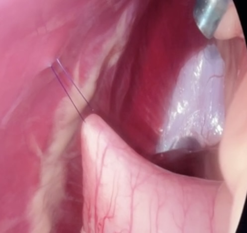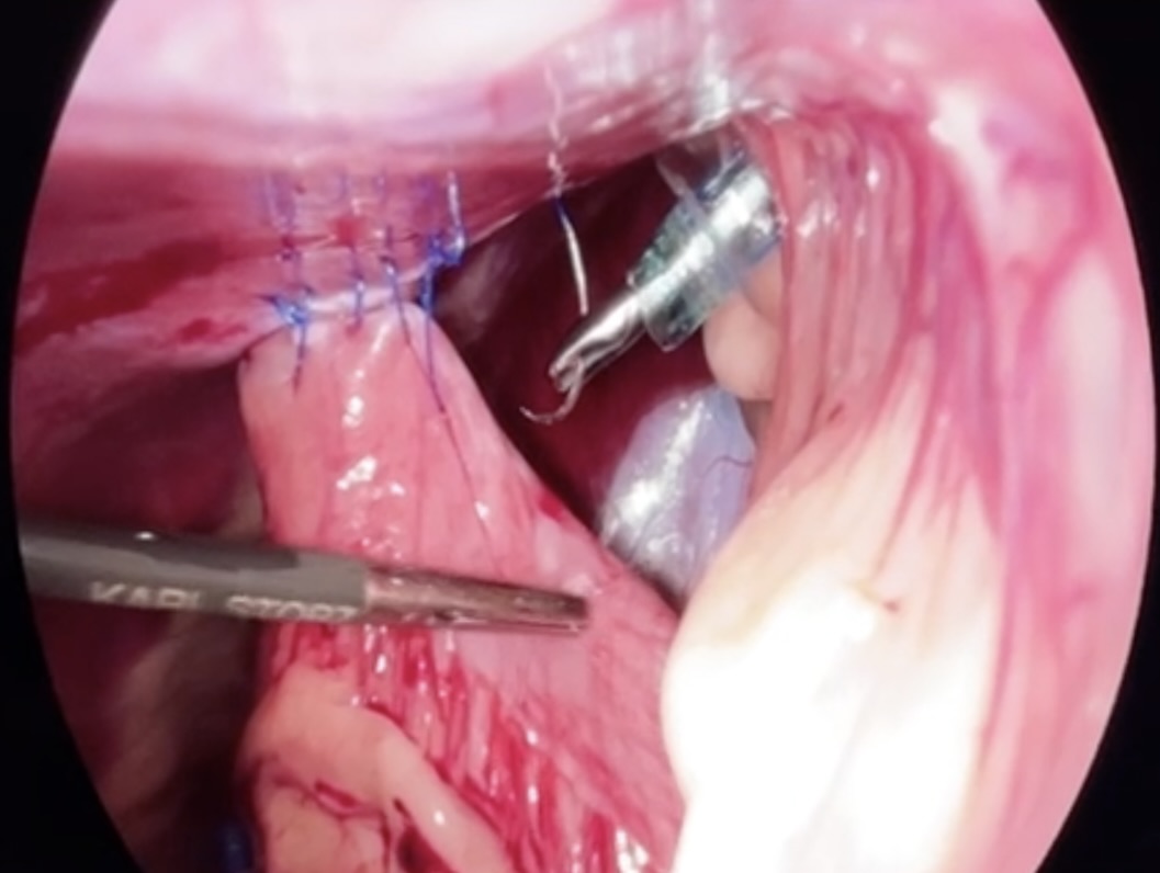 胃を腹壁と縫合する位置に仮止め結紮をし、固定します。