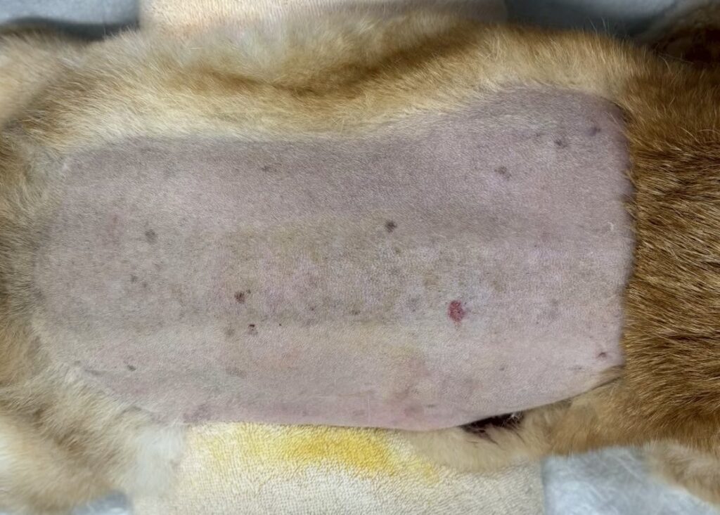 滅菌を保つため、毛刈りと消毒を実施します。腹腔鏡手術であるためリスクは低いですが、徹底した感染防止対策を講じています。
